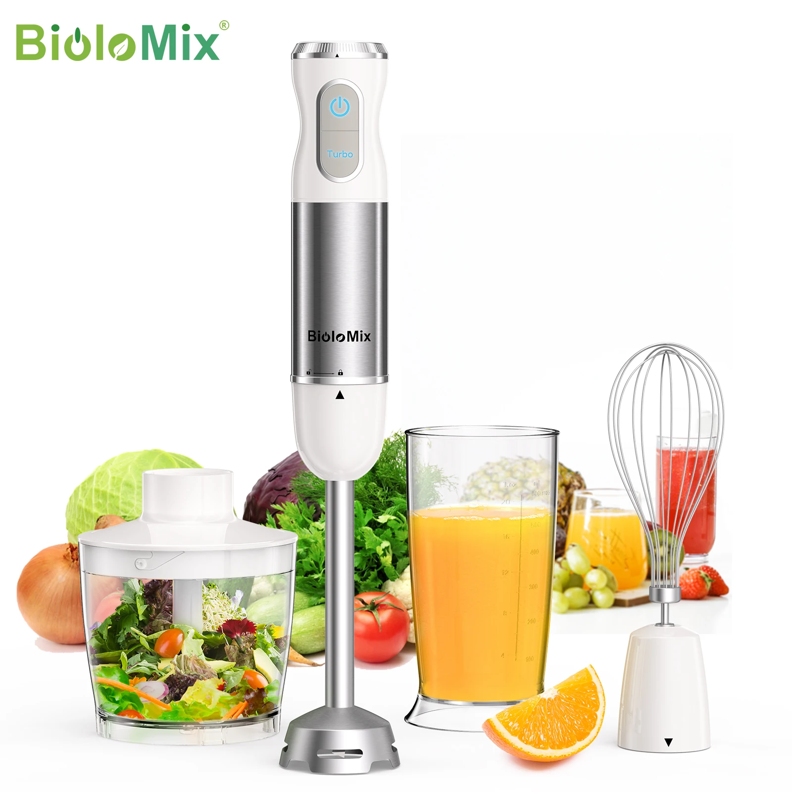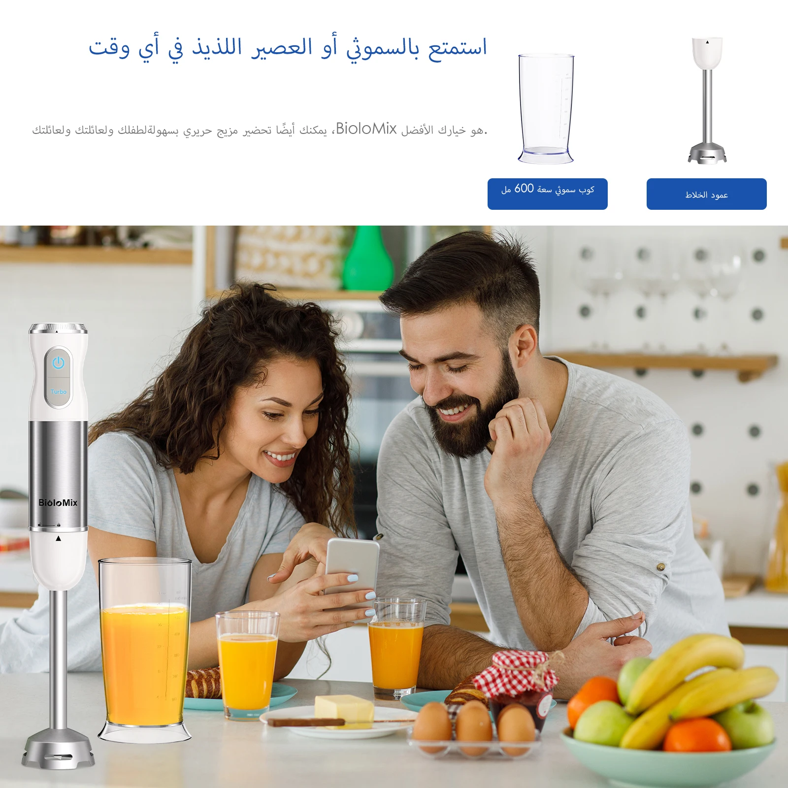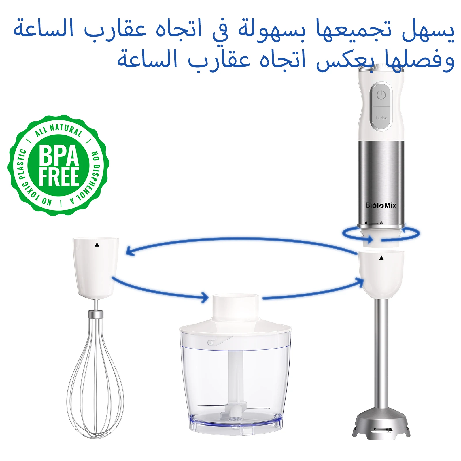 1. نظام مزج الغمر الكامل: الخلاط اليدوي لـ BioloMix مجهز بمرفقات للمزج والخفق والتقطيع. وعاء المروحية الفسيح وكوب العصير خالي تمامًا من بيسفا.
