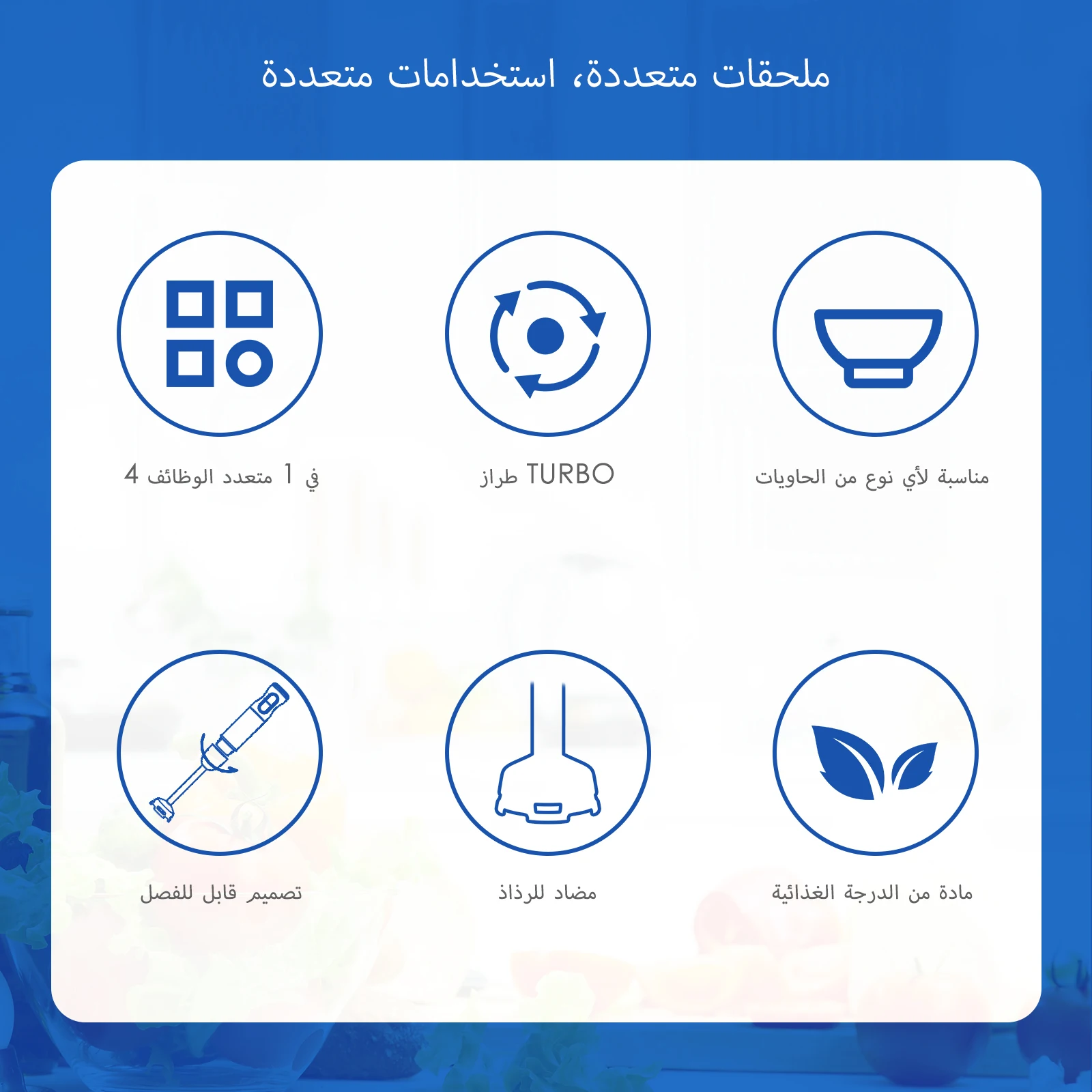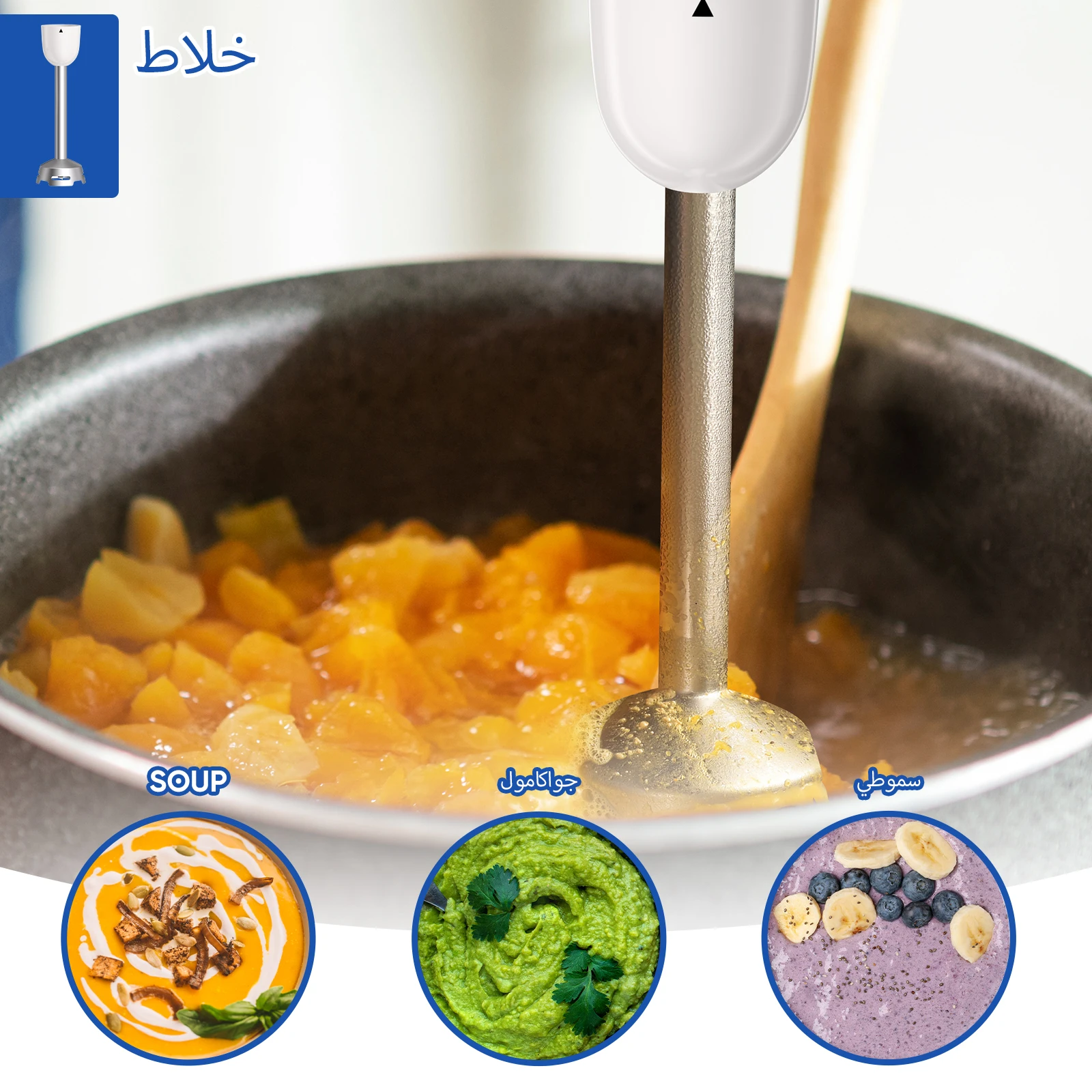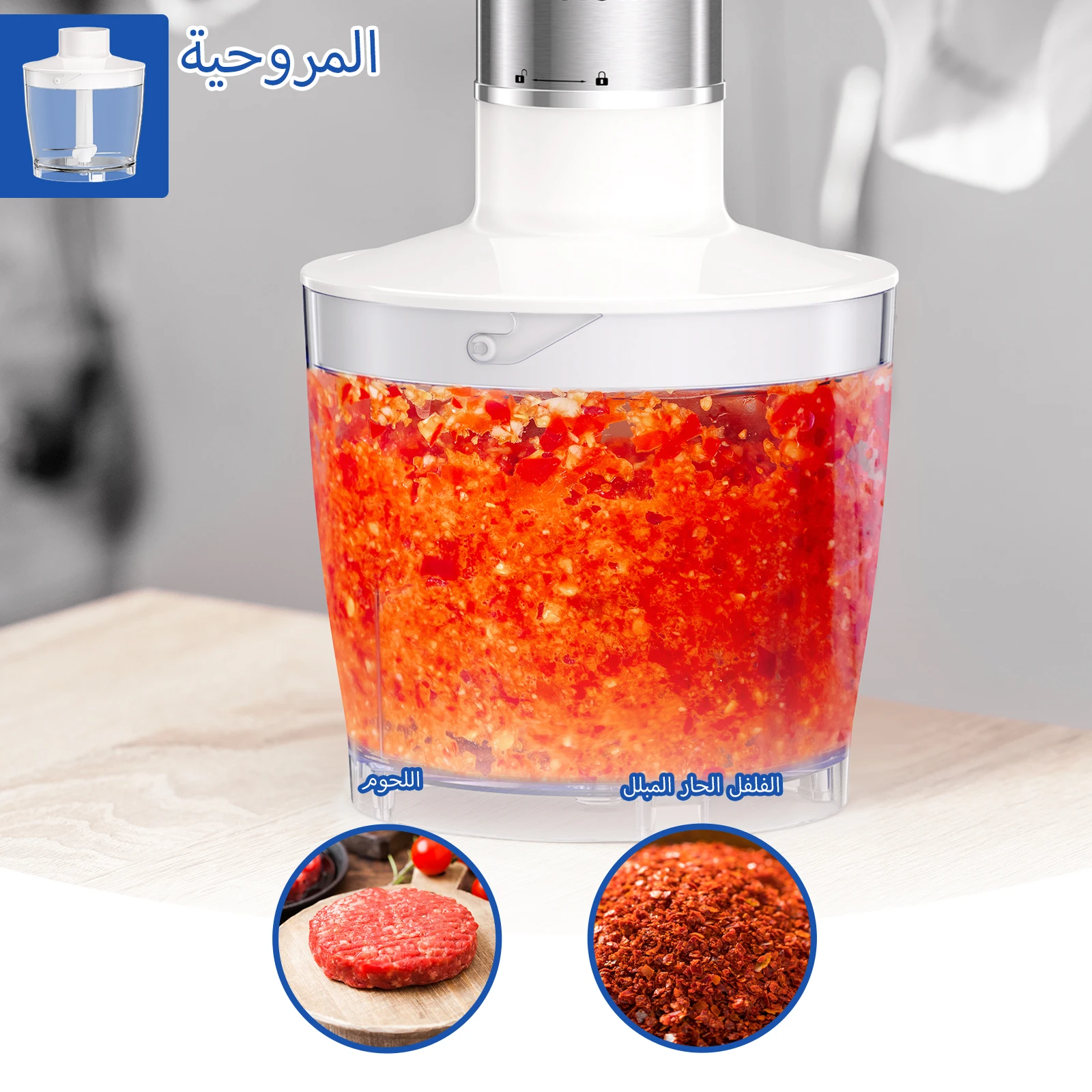 1. نظام مزج الغمر الكامل: الخلاط اليدوي لـ BioloMix مجهز بمرفقات للمزج والخفق والتقطيع. وعاء المروحية الفسيح وكوب العصير خالي تمامًا من بيسفا.
