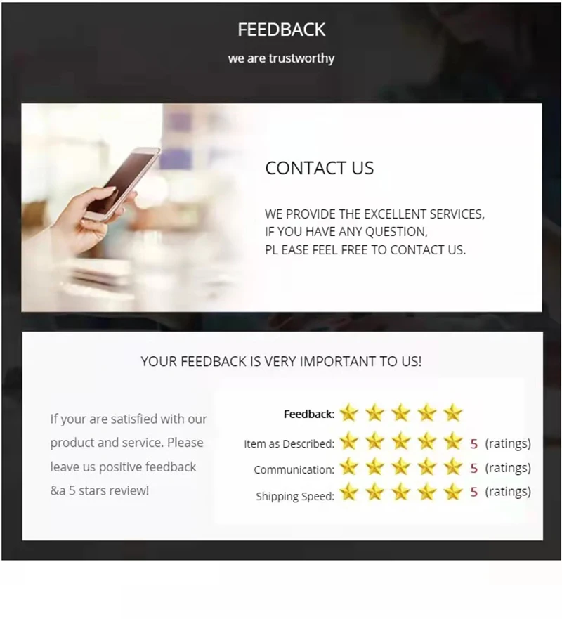 3. رضا العميل مهم جدا بالنسبة لنا. إذا كنت راضيا عن المنتجات التي حصلت عليها ، من فضلك لا تنسى أن تترك لنا ردود فعل إيجابية وتصنيف البائع مفصلة جيدة. ردود الفعل الإيجابية هي حقا مهمة جدا بالنسبة لنا!