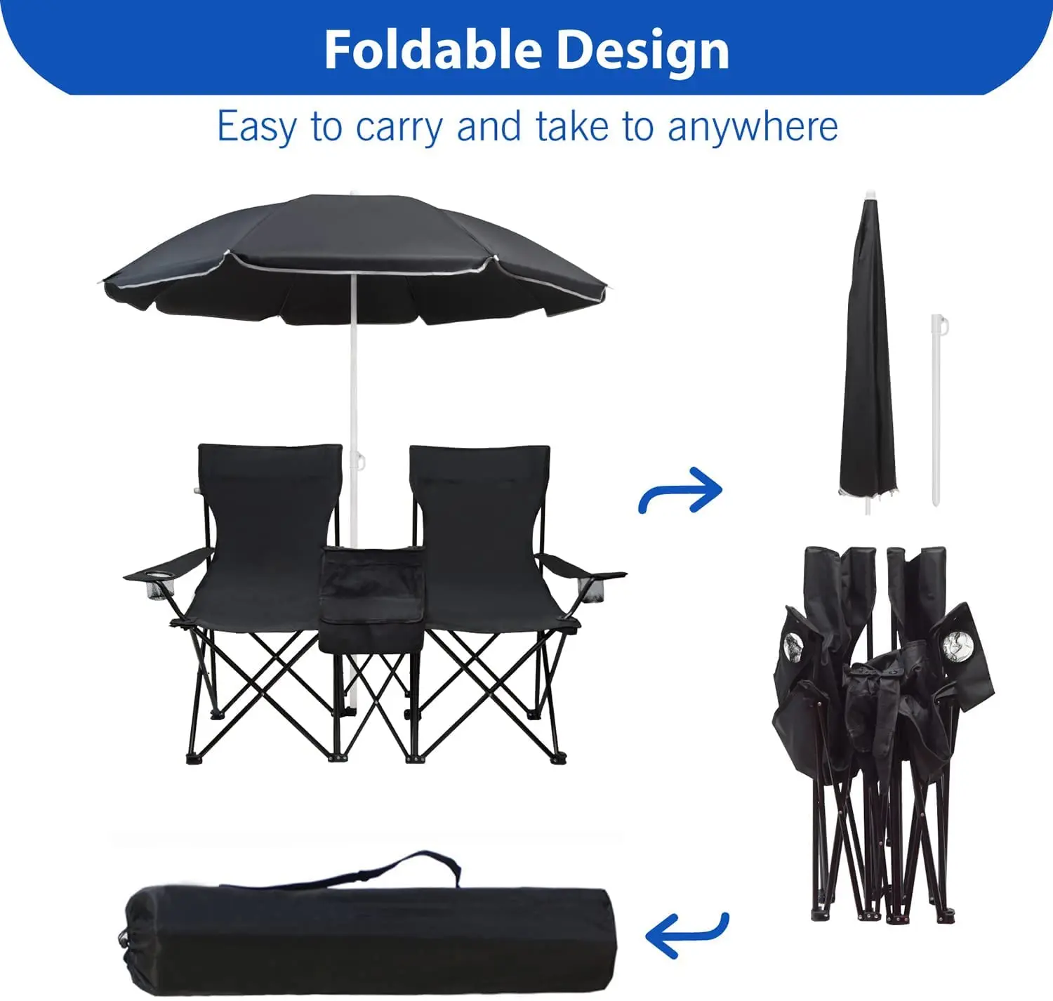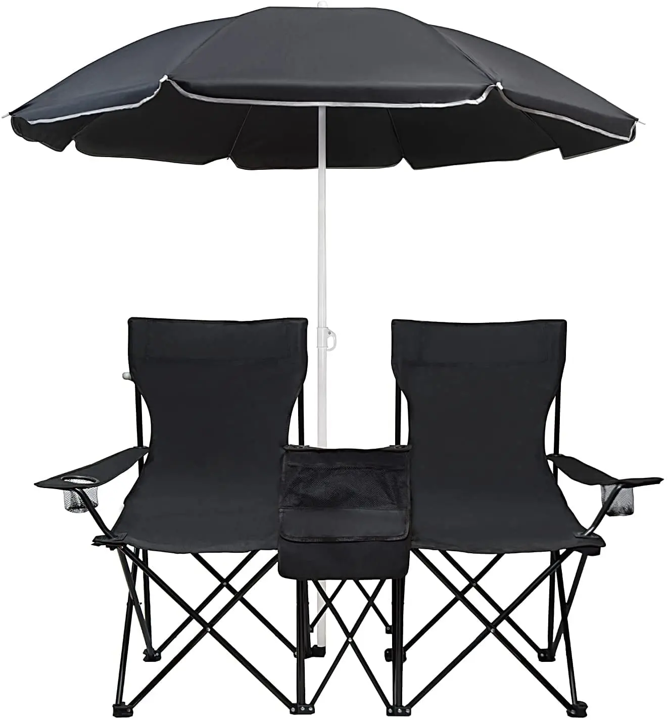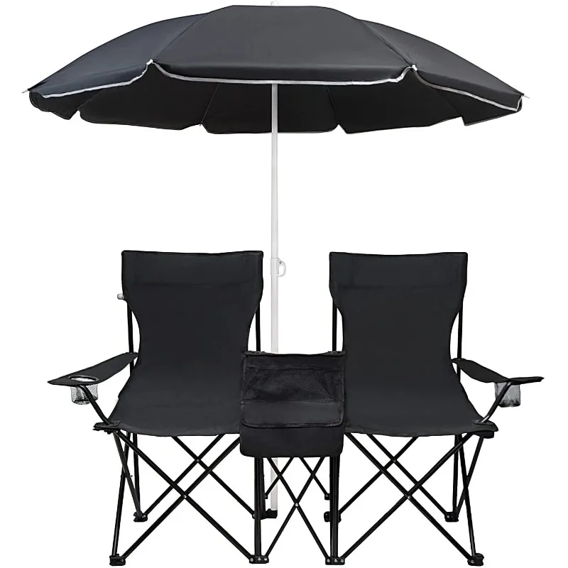 كرسي تخييم مزدوج بسيط مع مظلة، حامل أكواب، حقيبة مبردة، طاولة صغيرة، كل مقعد يمكن أن يدعم كرسي الشاطئ