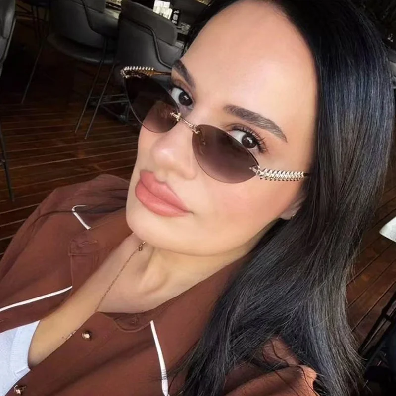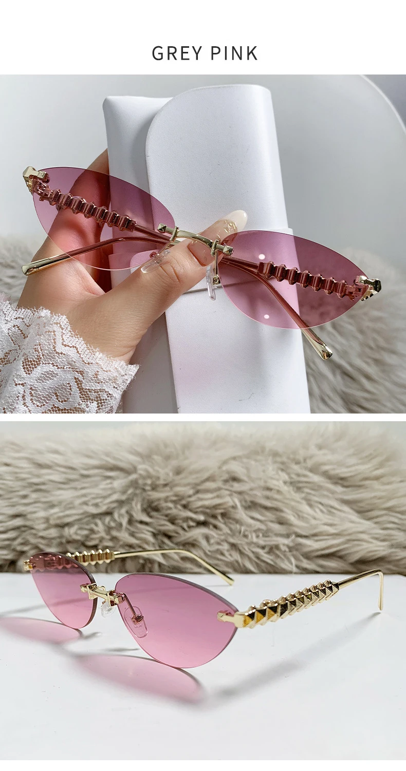 Cat Eye Rivet Rimless Sunglasses Women Luxury 2025 Fashion Brand Oval Narrow Sun Glasses Shades Trendy Elegant Unique Eyewear