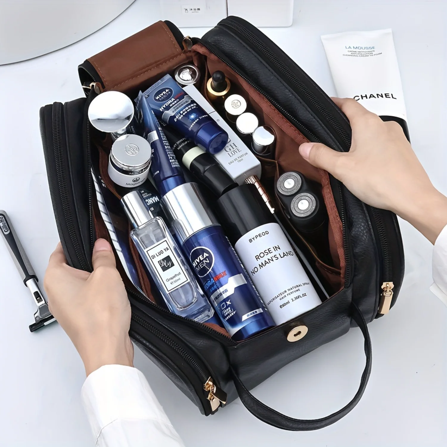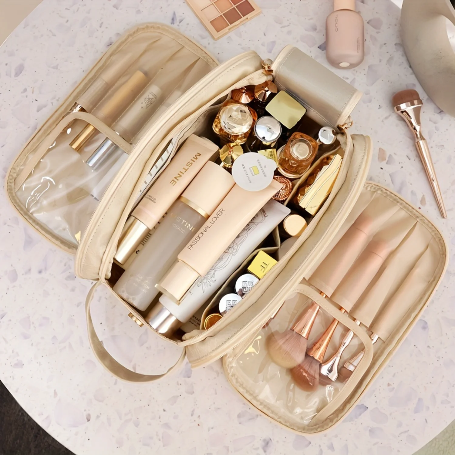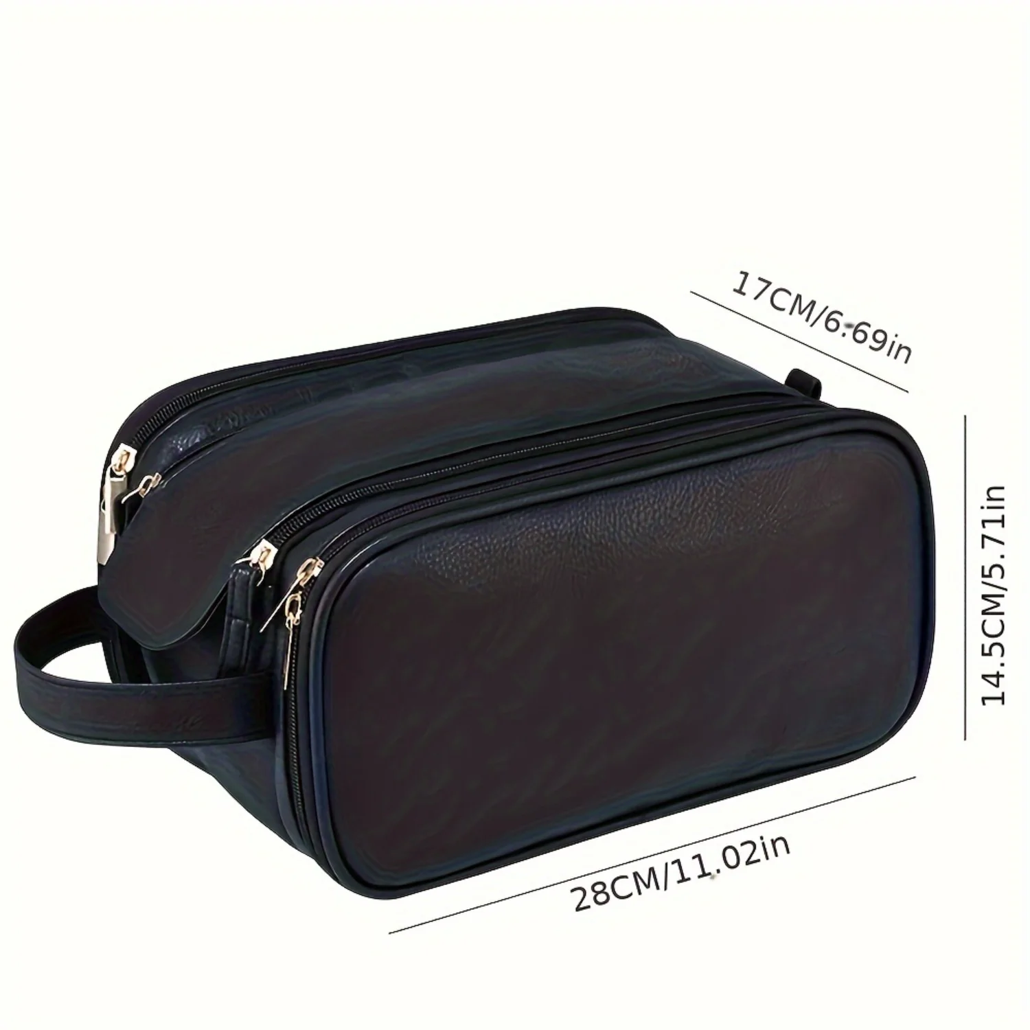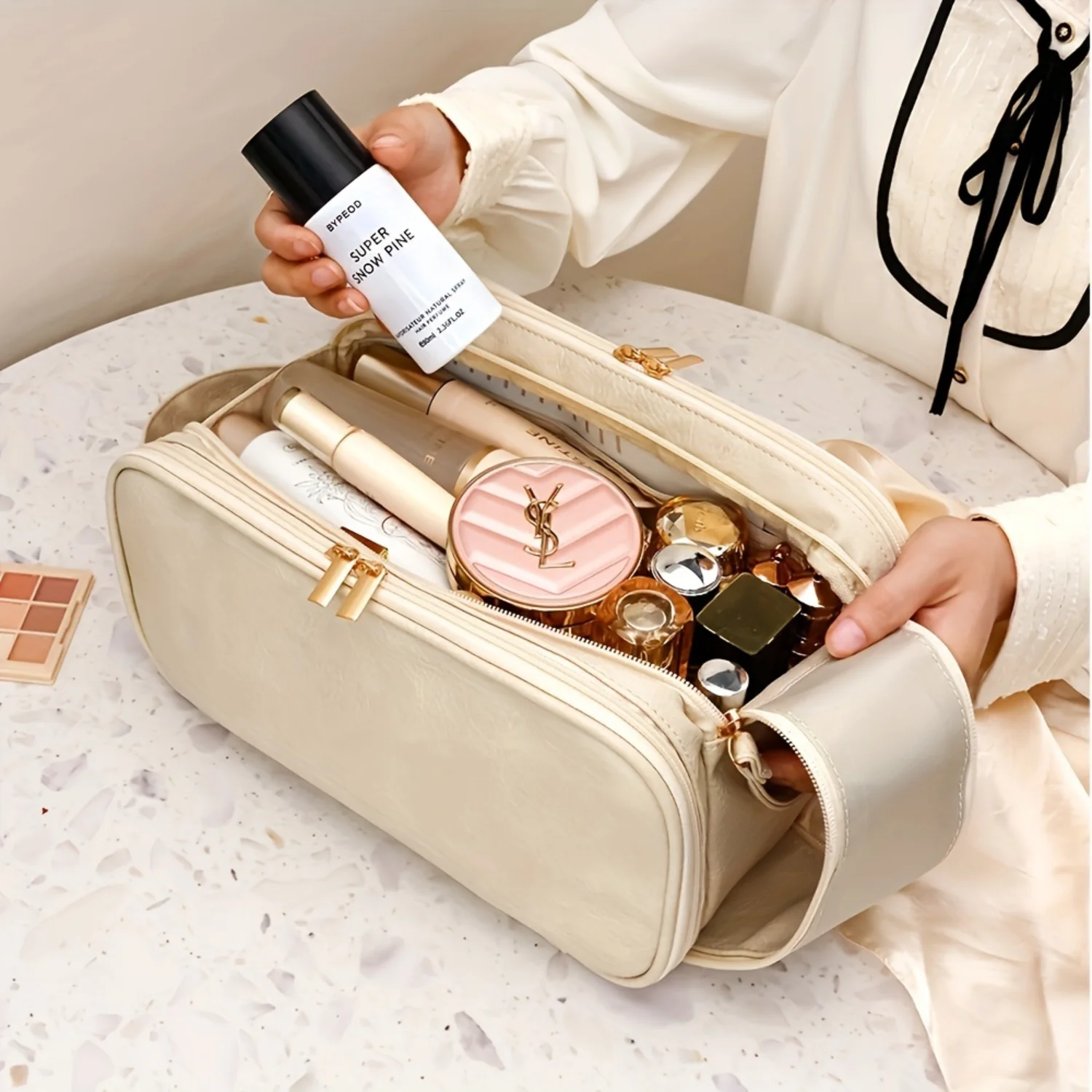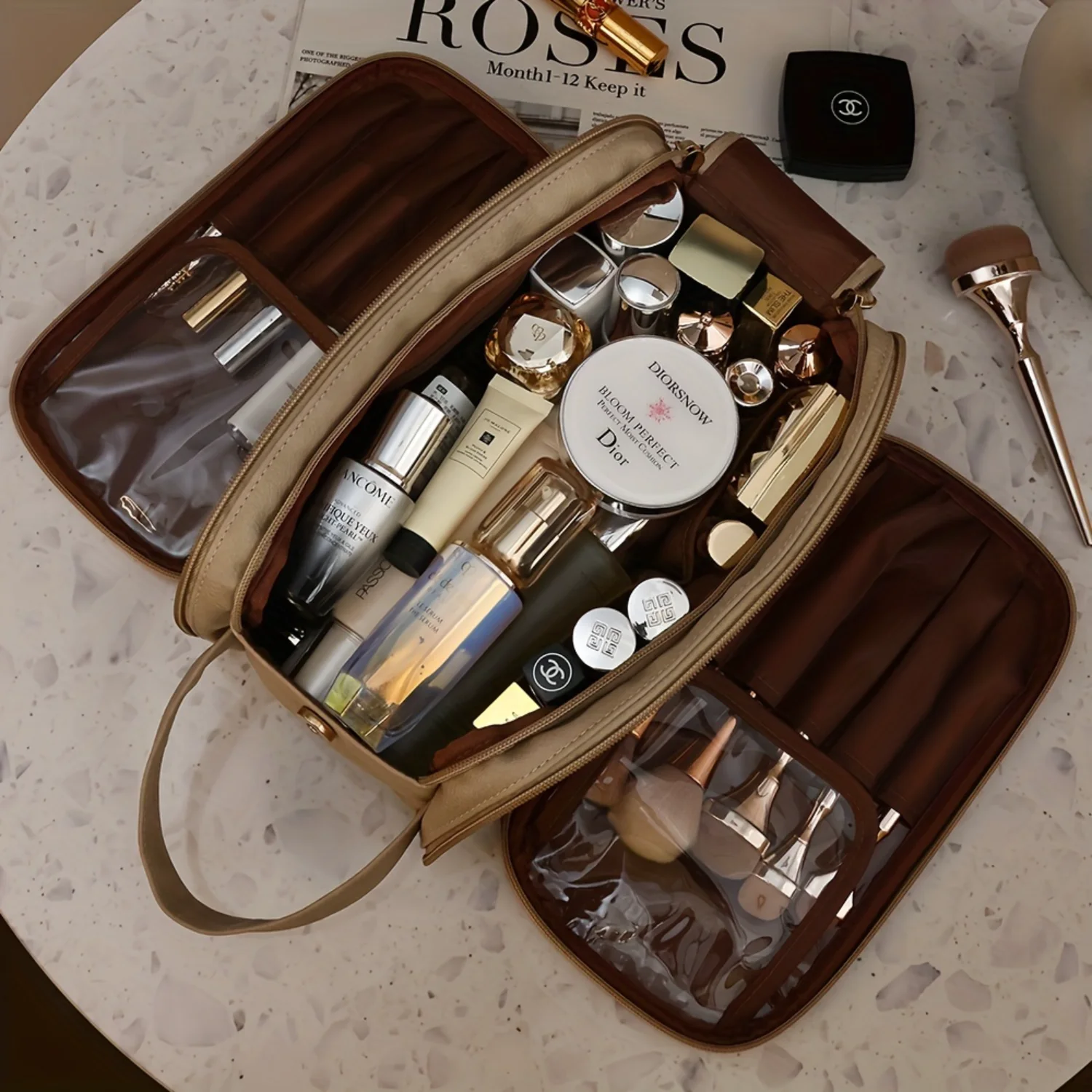 4. Keep your beauty essentials safe and secure with this innovative Large Capacity Toiletry Bag. The high-quality faux leather construction is both durable and stylish, making it the perfect travel companion. The double zipper design allows for easy access to all your products, while the brush holder keeps your brushes organized and protected. Whether you're on the go or just looking for a chic way to store your makeup, this bag has you covered.