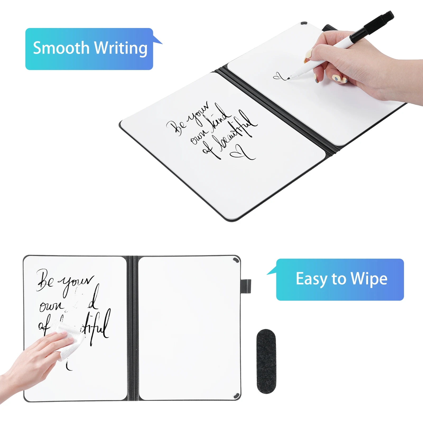 ✅ 【سبورة بيضاء مزدوجة الجوانب】تتميز هذه السبورة البيضاء المدمجة بتصميم مزدوج الجوانب لتحسين عملية الإبداع الخاصة بك.يبلغ مقاس كل لوحة مسح جافة 210 × 148 مم، وهي مثالية للحسابات المكثفة وتدوين الملاحظات والعصف الذهني والتدريس.قم بالتبديل بين المهام دون عناء باستخدام لوحة المسح الجافة المحمولة هذه، وهي حل شامل لجميع احتياجات السبورة البيضاء الخاصة بك.