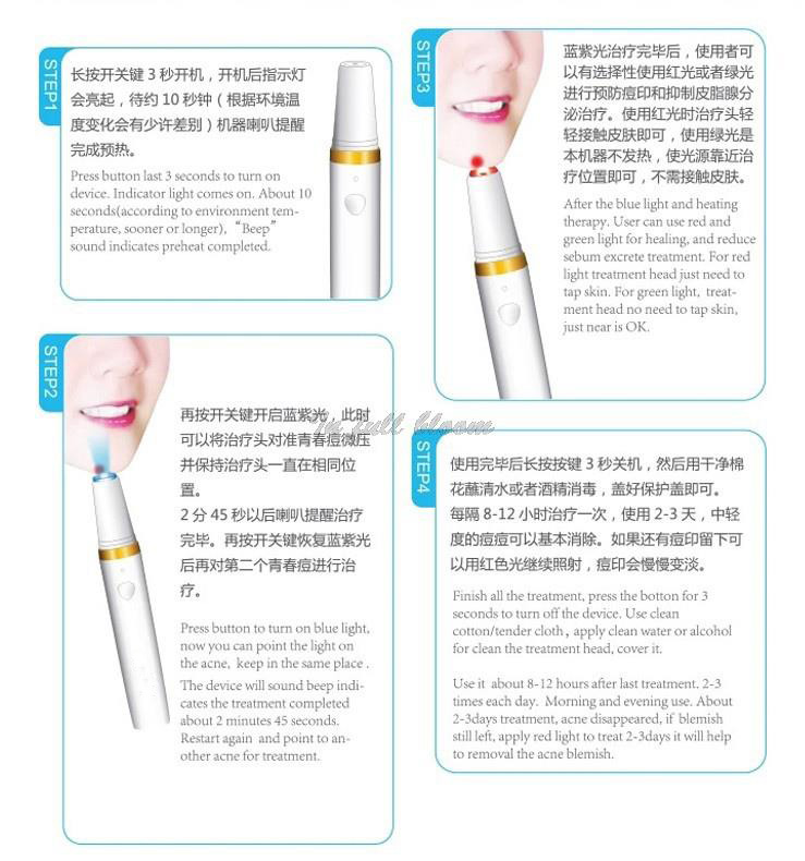 ** في عملية العلاج ، فإن الجهاز صفير في كل 5 ثوان ، أفير 2.5S العلاج هو وقف ، انتظر لمدة 5 ثوان ، يتم بدء الدورة الجديدة. وفقا لحالة بشرتك لضبط وقت العلاج ، عموما هو 10 دقيقة.
