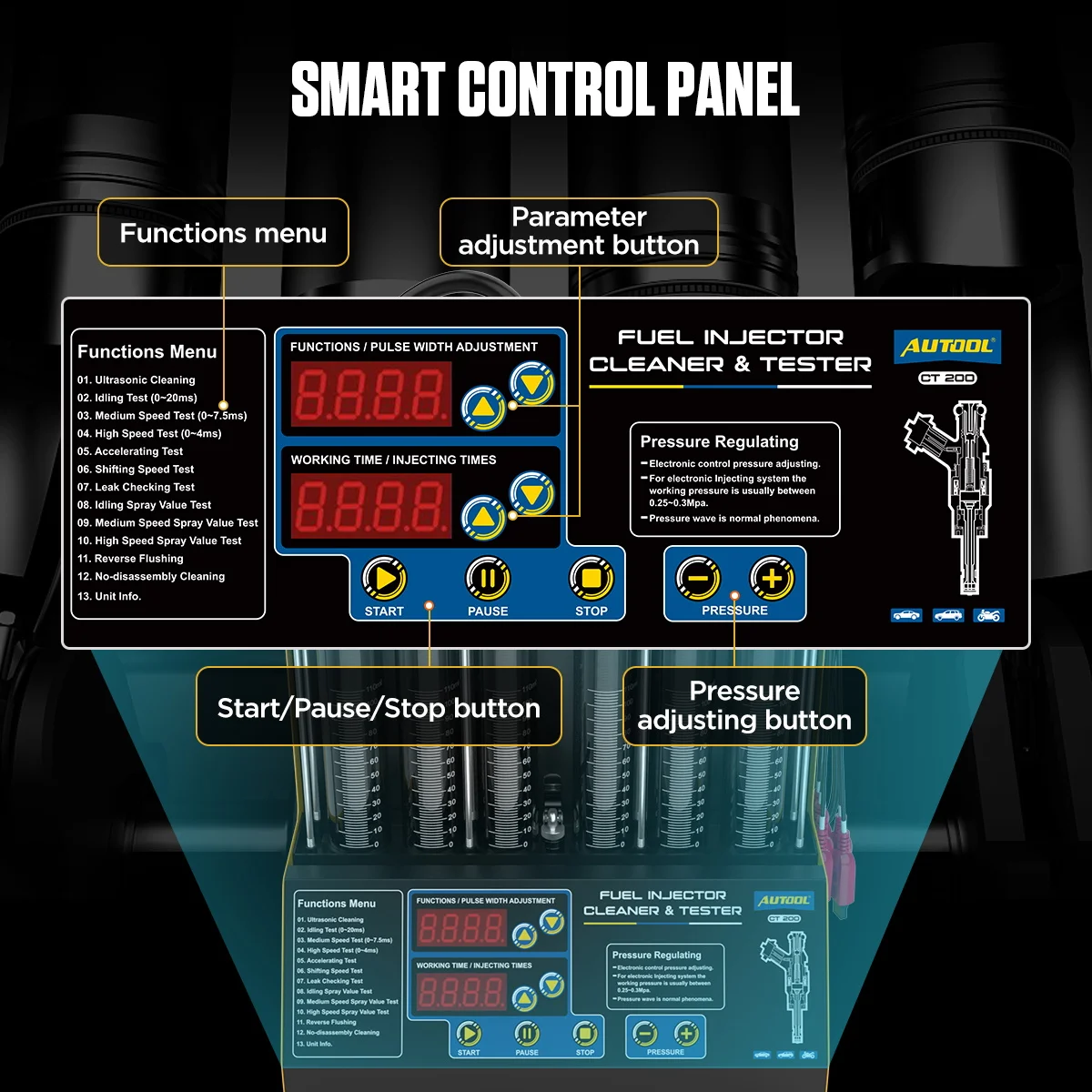 【Automatic Cleaning and Testing】Fuel pressure control through microcomputer offers stable pressure control and largeadjustable range, which is suitable for all EGI vehicles and can help to achieve automatic cleaning and testing of injectors.