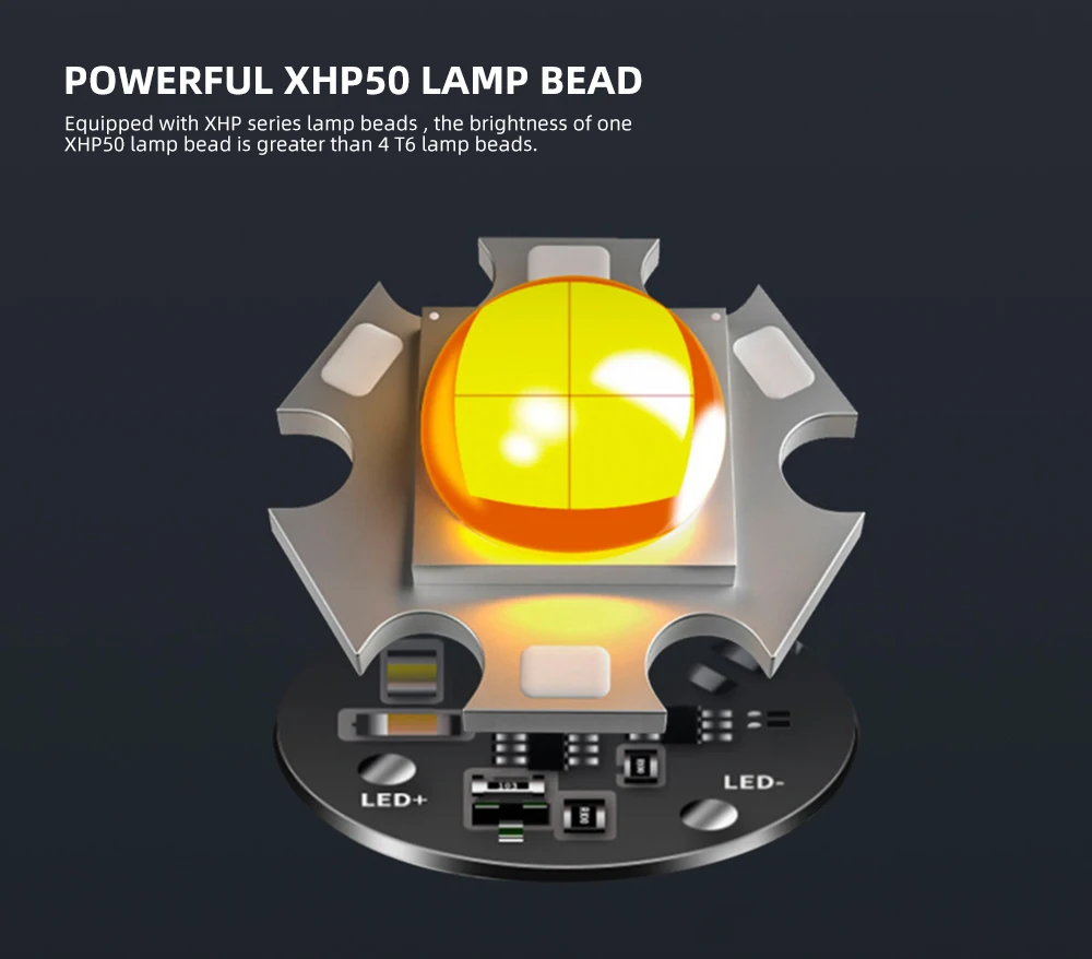 1. مصباح LED XHP50 فائق السطوع مسؤول عن إضاءة الأجسام البعيدة بإضاءة ساطعة ، ويمكن أن تصل المسافة المضيئة إلى الأمتار