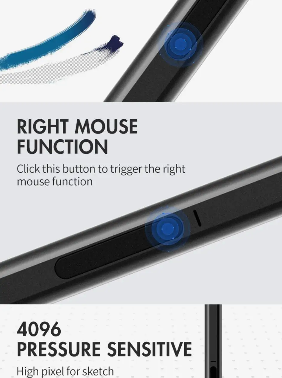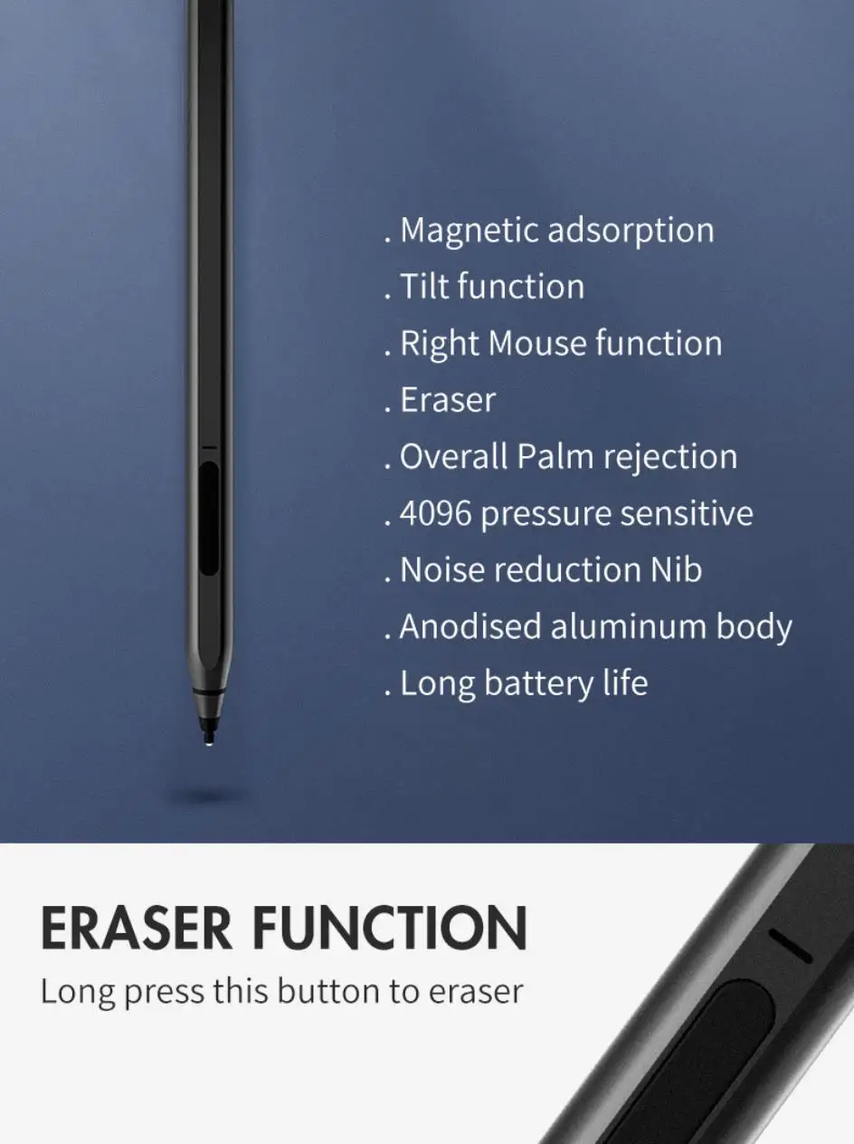 --يسهل الجسم النحيف المزود بزر النقر الأيمن والحذف المدمج التحكم، دون الاعتماد الكامل على فأرة الكمبيوتر. يتيح لك القلم المحسن وضع راحة يدك بشكل مريح على الشاشة، دون القلق بشأن اللمس عن طريق الخطأ.