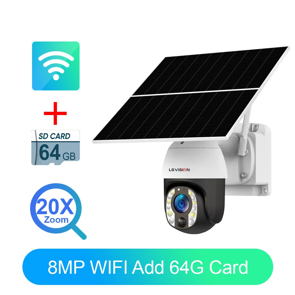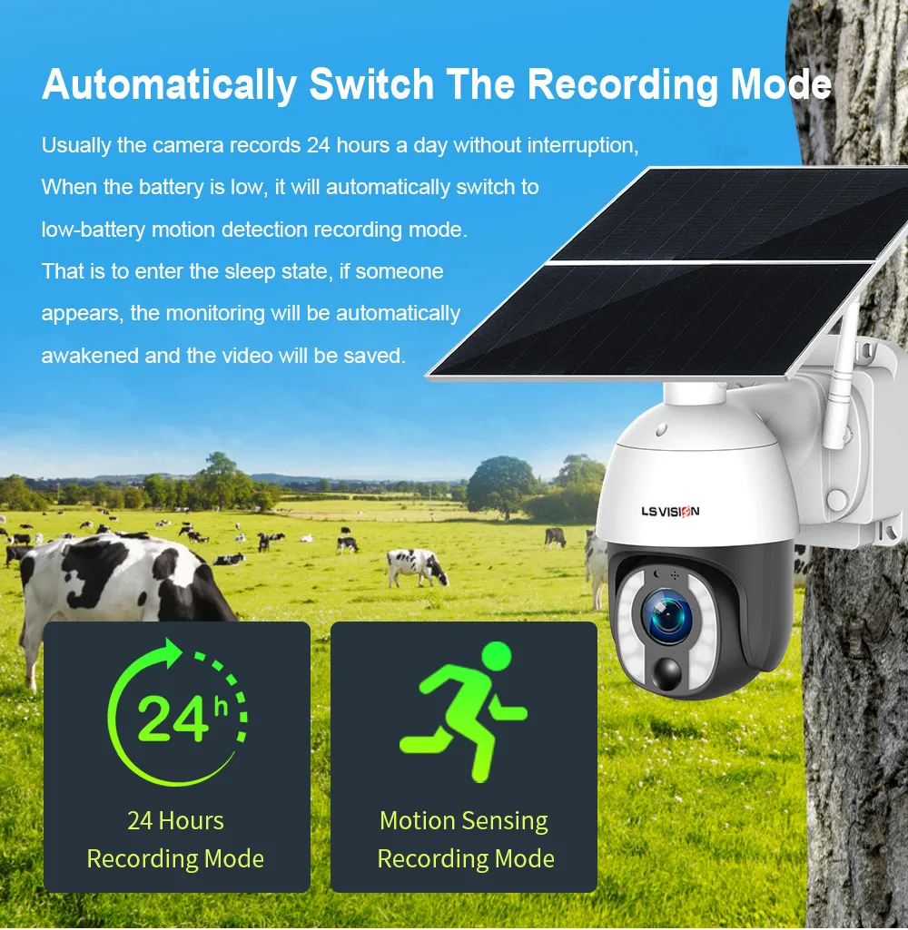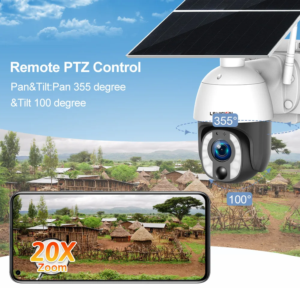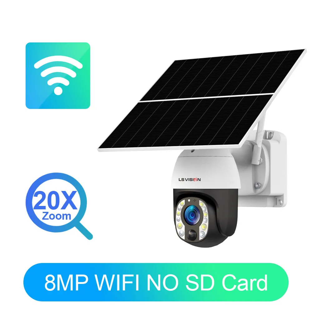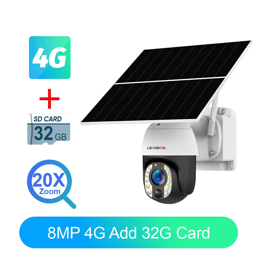 كاميرا أمان تعمل بالطاقة الشمسية LS VISION 4K 8MP تكبير 20X تسجيل 24/7 ساعات 4G/WiFi تتبع تلقائي كاميرات بطارية 30000 مللي أمبير في الساعة لوحة 20 وات