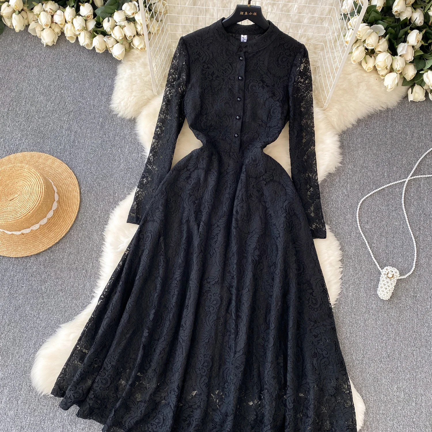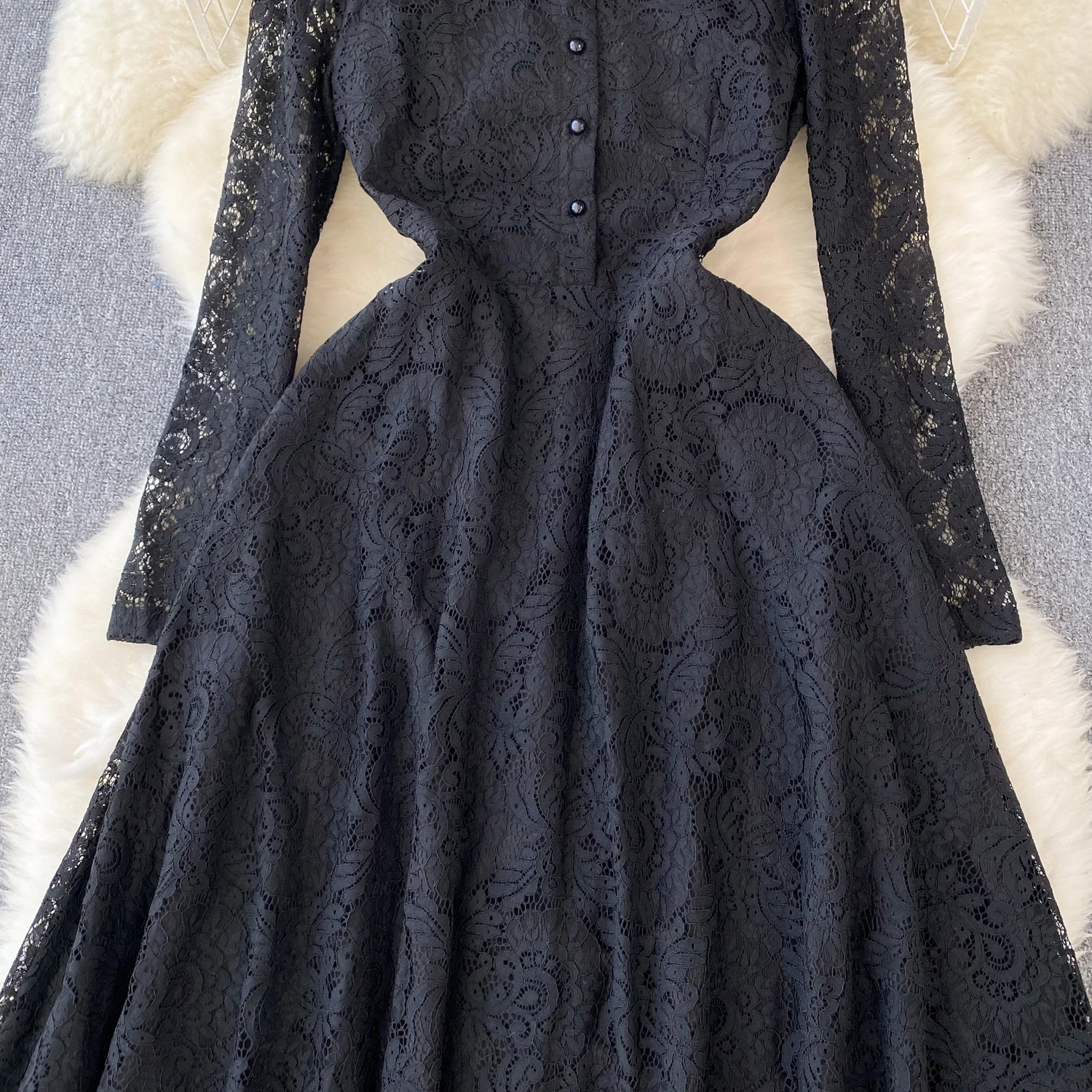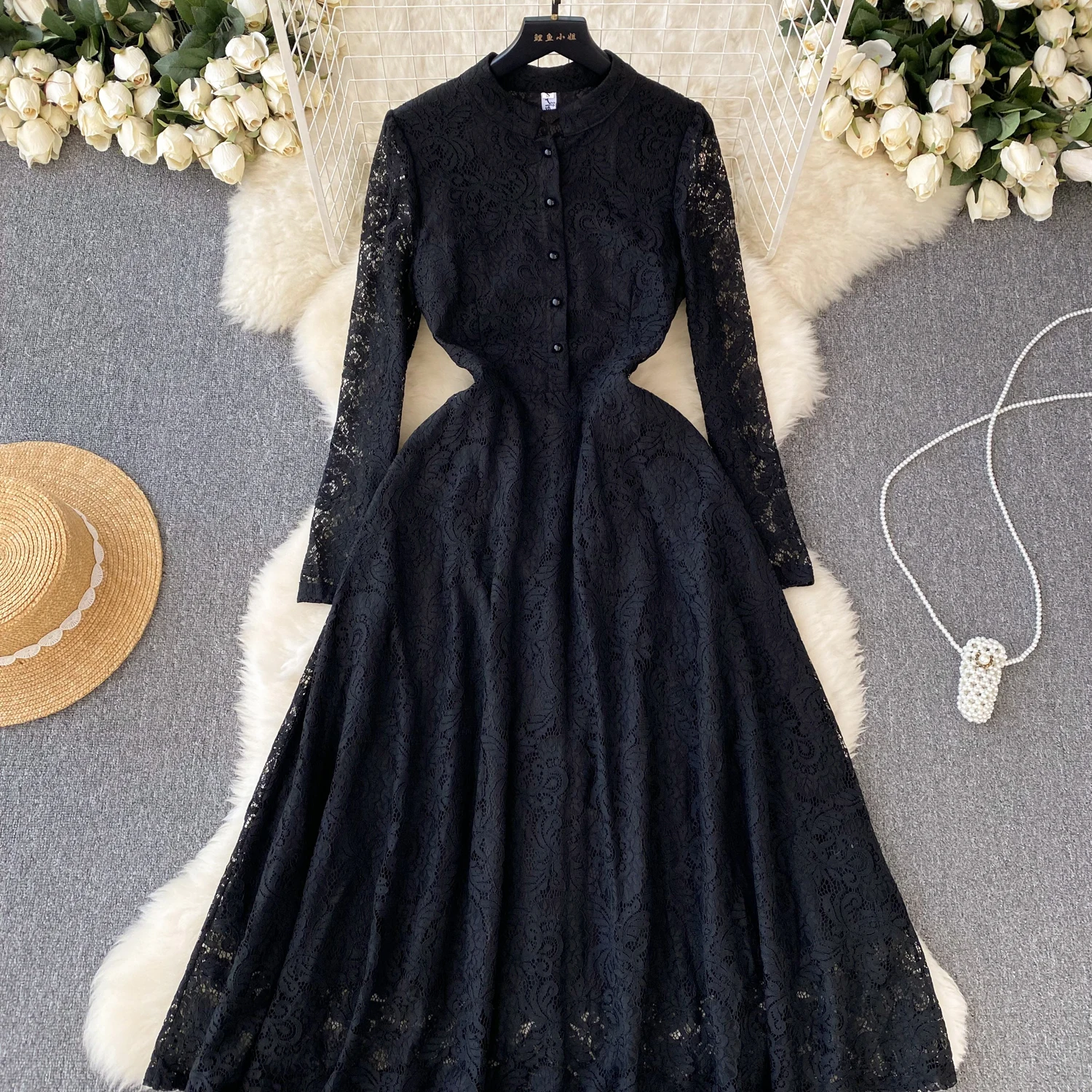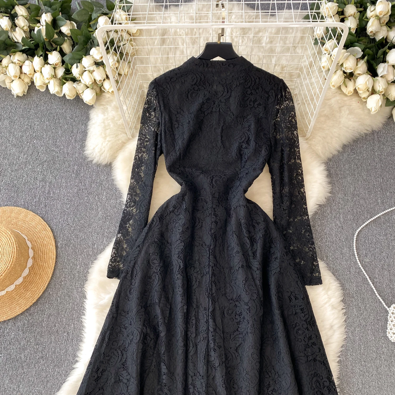 فستان نسائي أنيق عتيق على طراز هيبورن من الدانتيل بأكمام طويلة وياقة واقفة، فستان أسود متوسط الطول بخصر عالي وقصة على شكل ح...