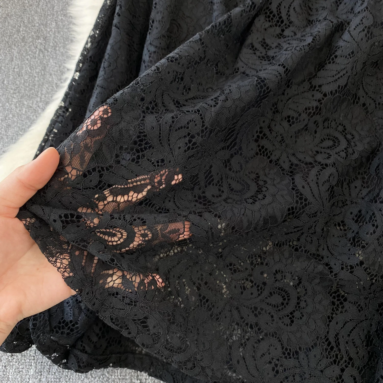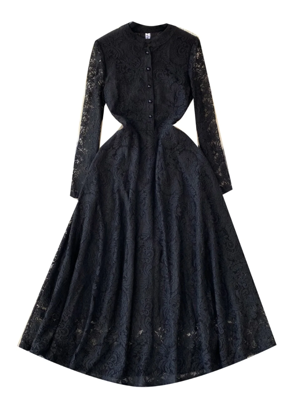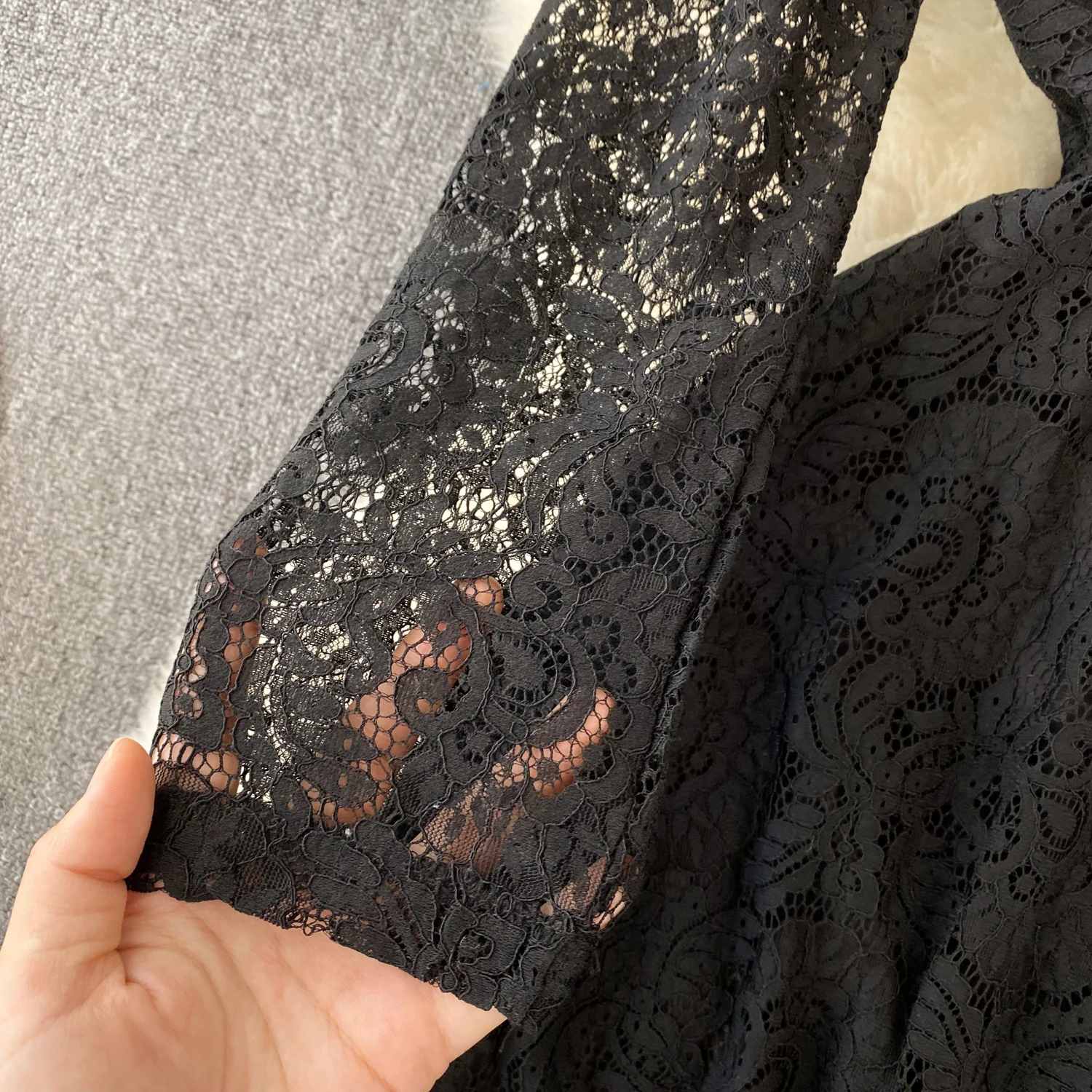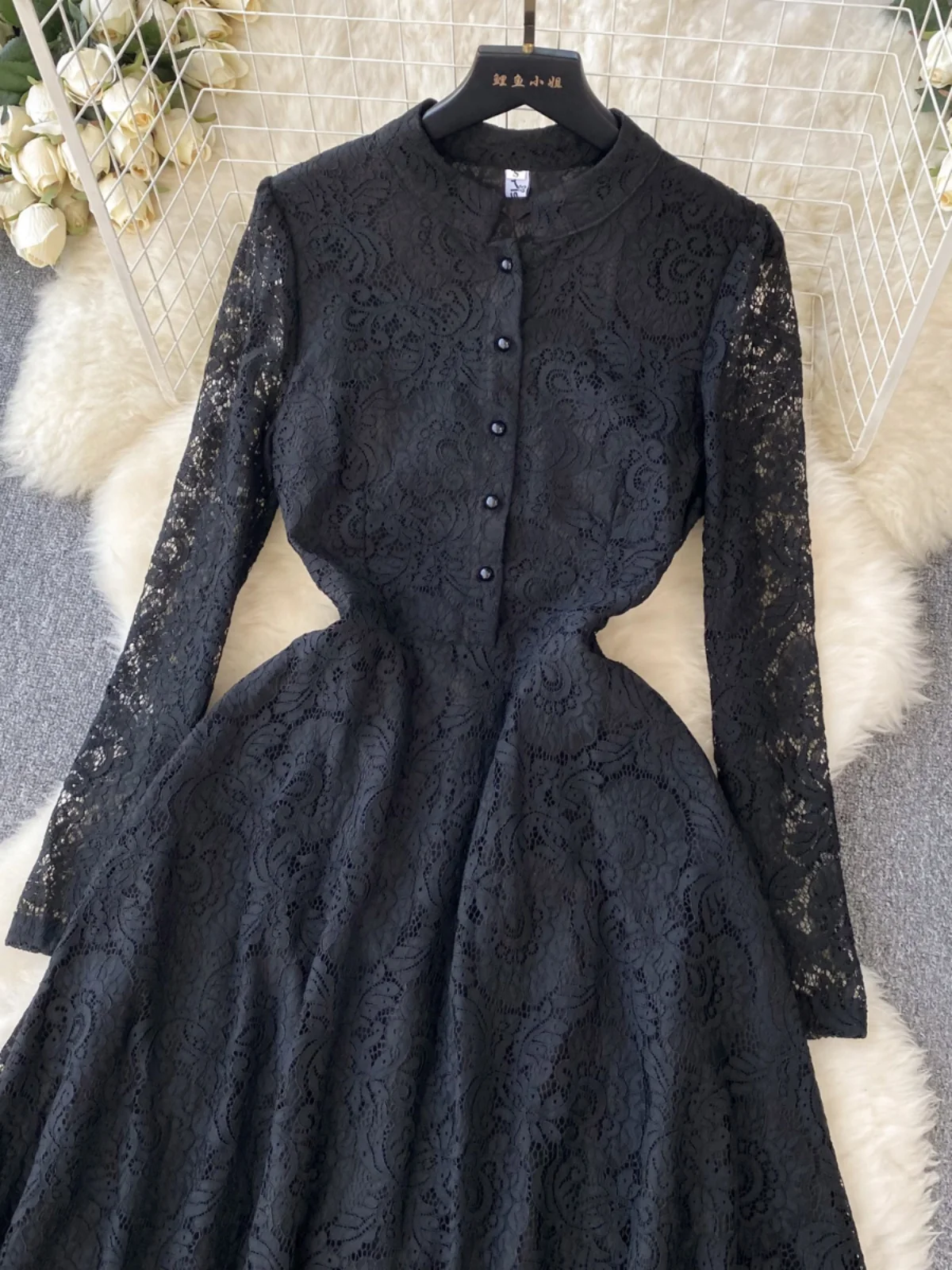 فستان نسائي أنيق عتيق على طراز هيبورن من الدانتيل بأكمام طويلة وياقة واقفة، فستان أسود متوسط الطول بخصر عالي وقصة على شكل ح...