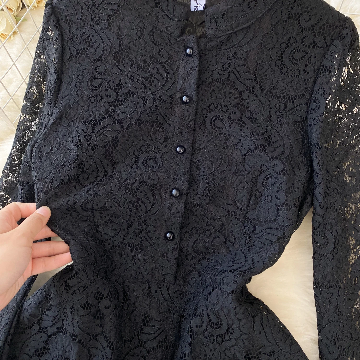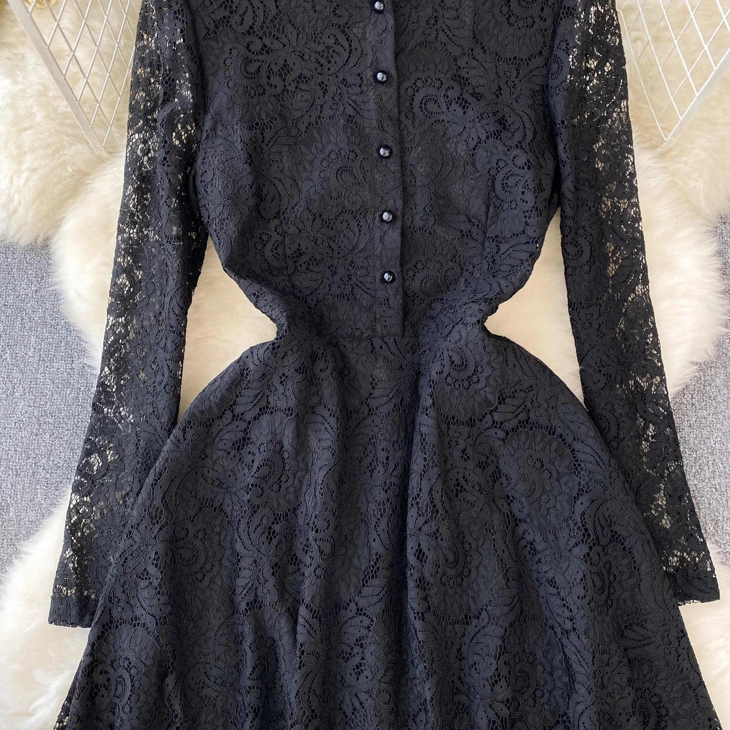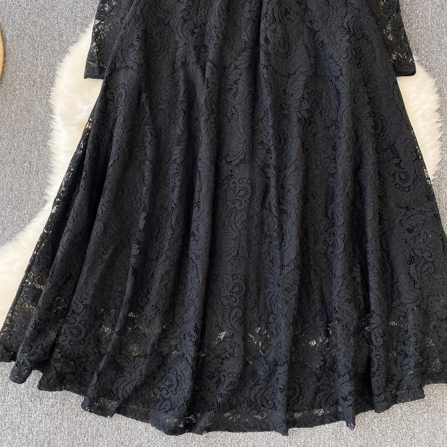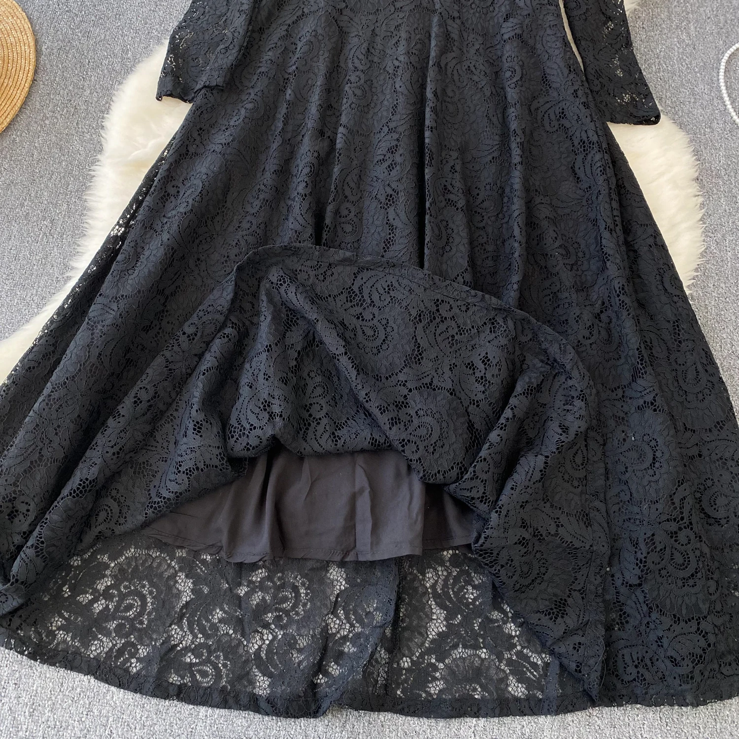 فستان نسائي أنيق عتيق على طراز هيبورن من الدانتيل بأكمام طويلة وياقة واقفة، فستان أسود متوسط الطول بخصر عالي وقصة على شكل ح...