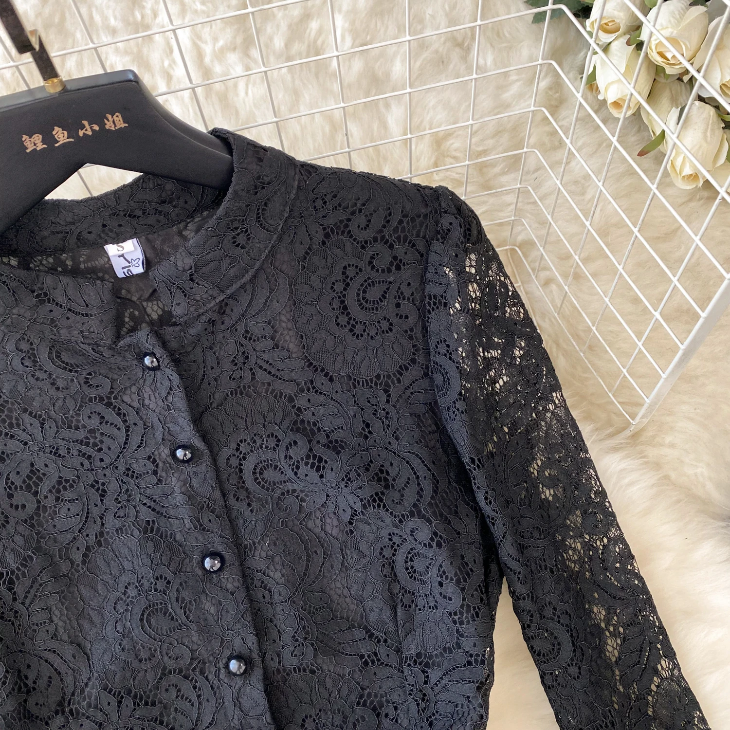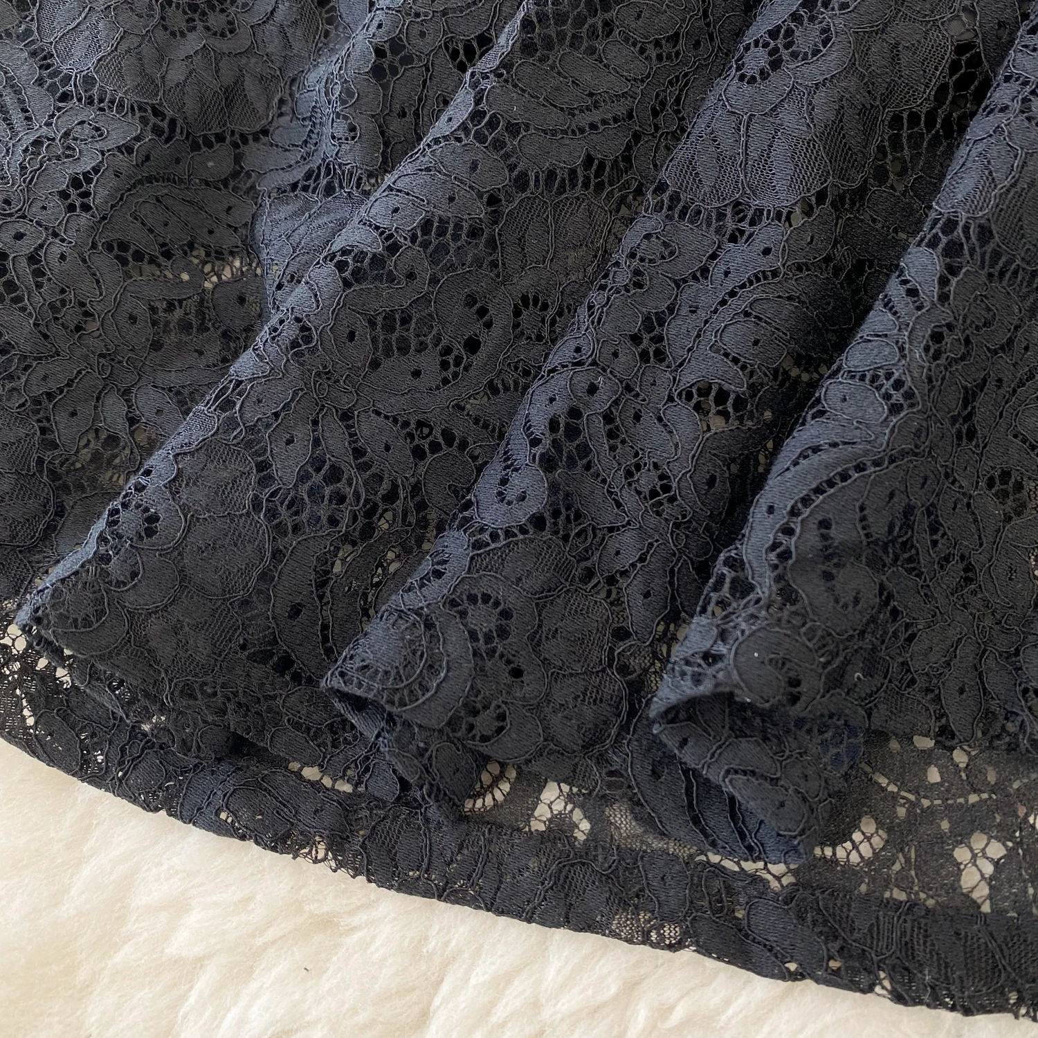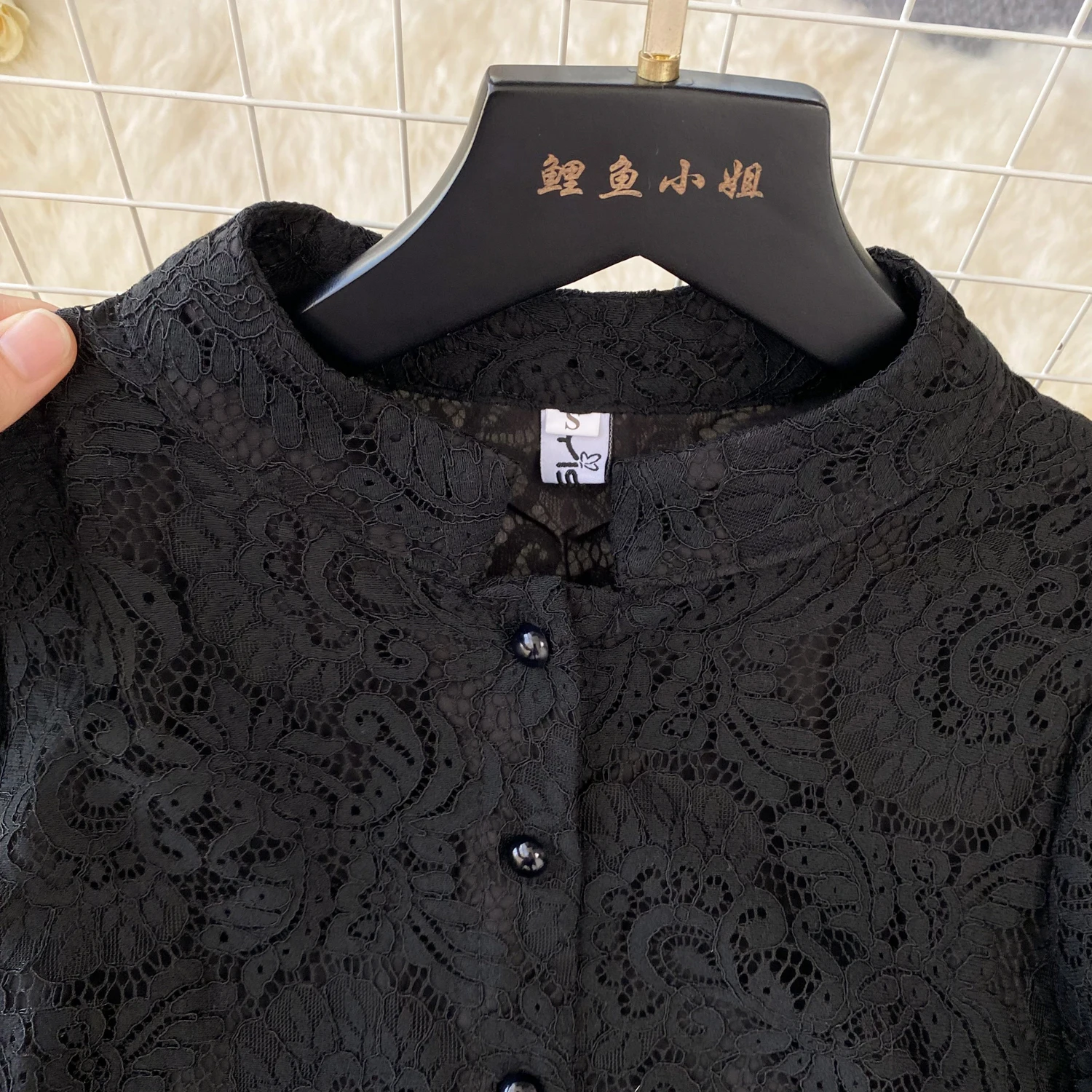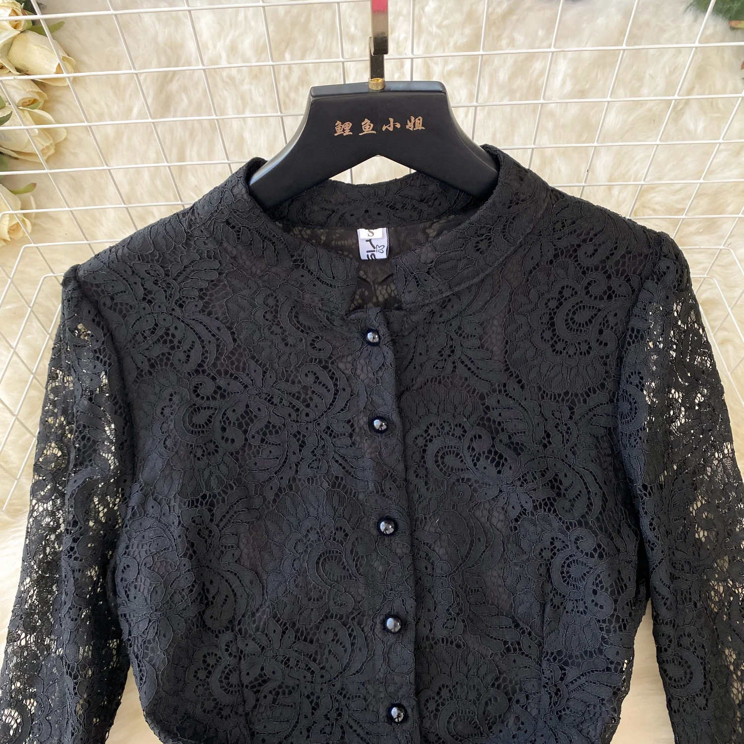 فستان نسائي أنيق عتيق على طراز هيبورن من الدانتيل بأكمام طويلة وياقة واقفة، فستان أسود متوسط الطول بخصر عالي وقصة على شكل ح...