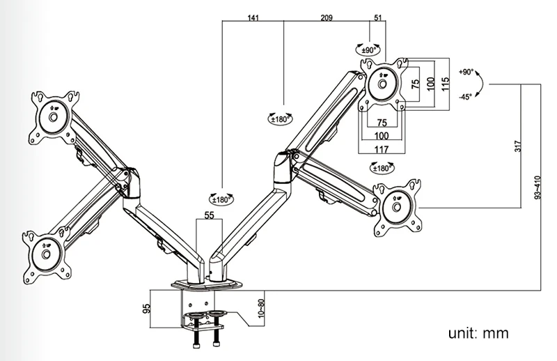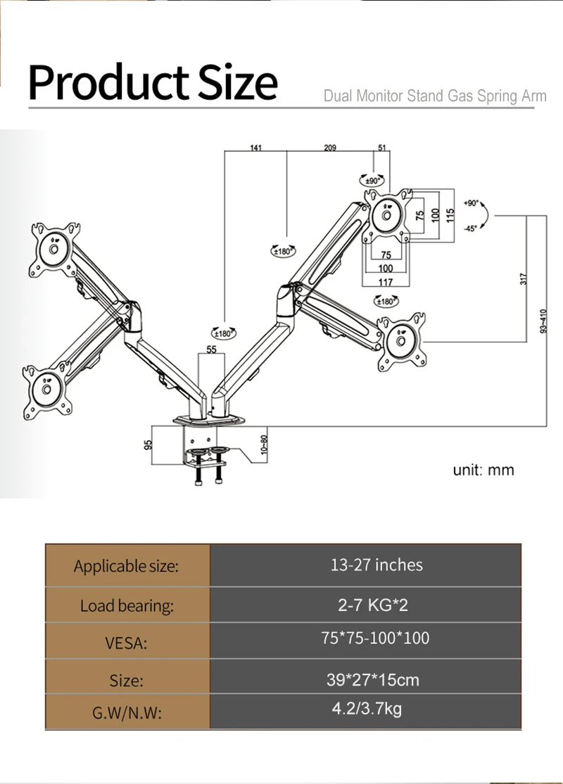 360 درجة الغاز الربيع سطح المكتب 17 "-27" المزدوج رصد حامل الذراع